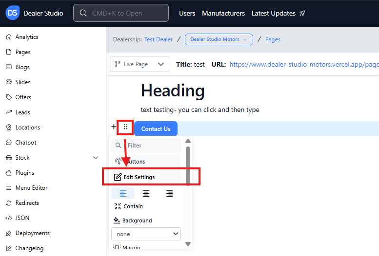 Hover your mouse over the left-hand side of the page where the button is until the 6 dots icon appears. Click on the icon, then select the Edit Settings button.
