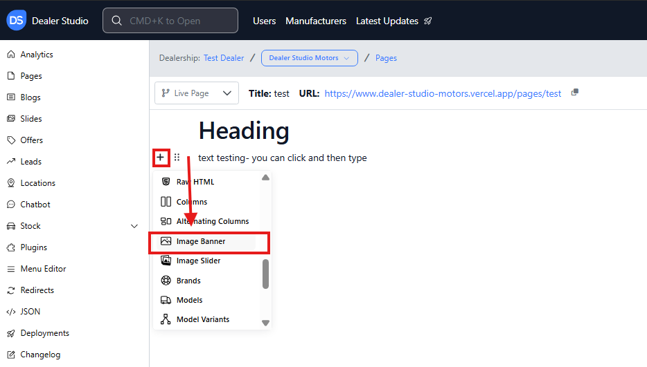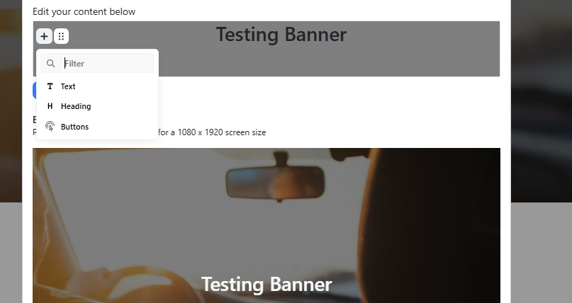 Once the base of the banner is set, you can add content on top. Simply click the + button to the left of the Image Banner text to add text, headings, or buttons over the banner.