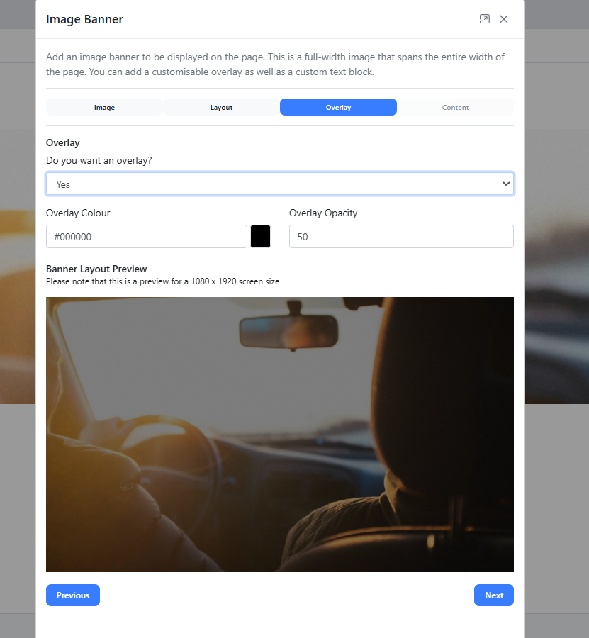 An overlay is optional and can be used to enhance readability or add emphasis to text by darkening or lightening the background. If using an overlay, you can select the colour and opacity as shown: