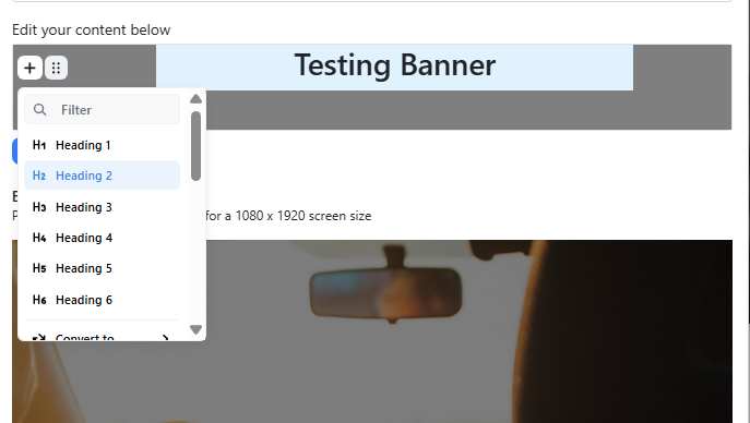 To edit the format of text or headings added to the banner, select the 6 dot icon. Here, you can change the text size, alignment, colour, margins, padding etc.