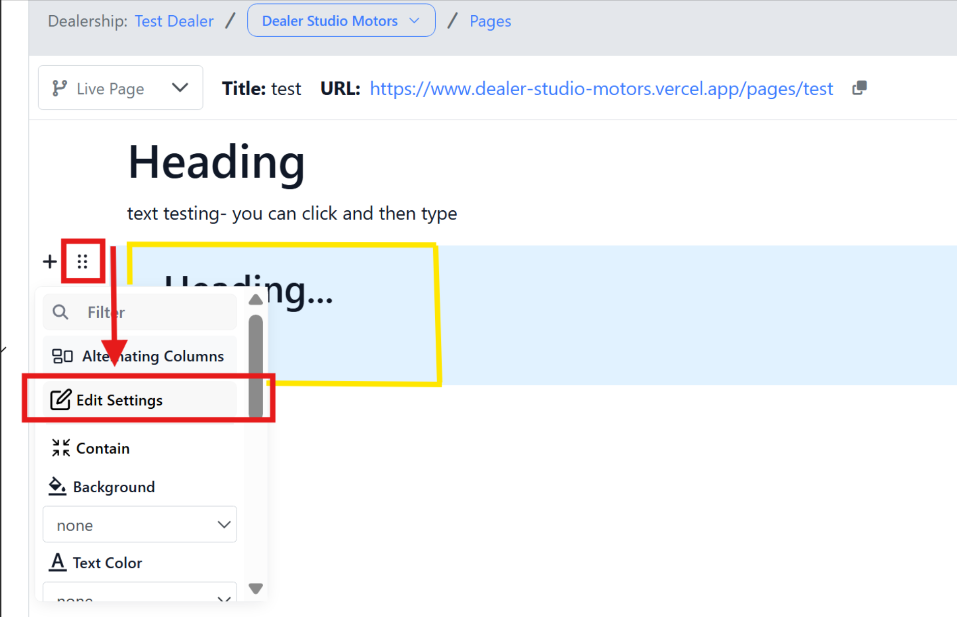 Text with Heading... and Text block... will appear. Hover your mouse over the left-hand side of the page where this text is until the 6 dots icon appears. Click on the icon, then select the Edit Settings button.