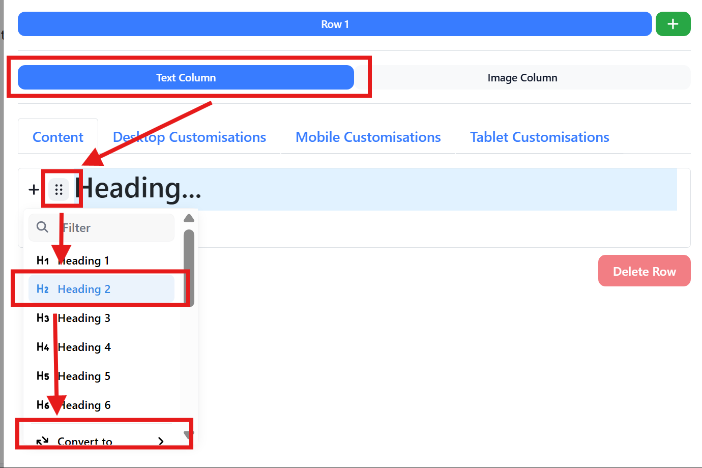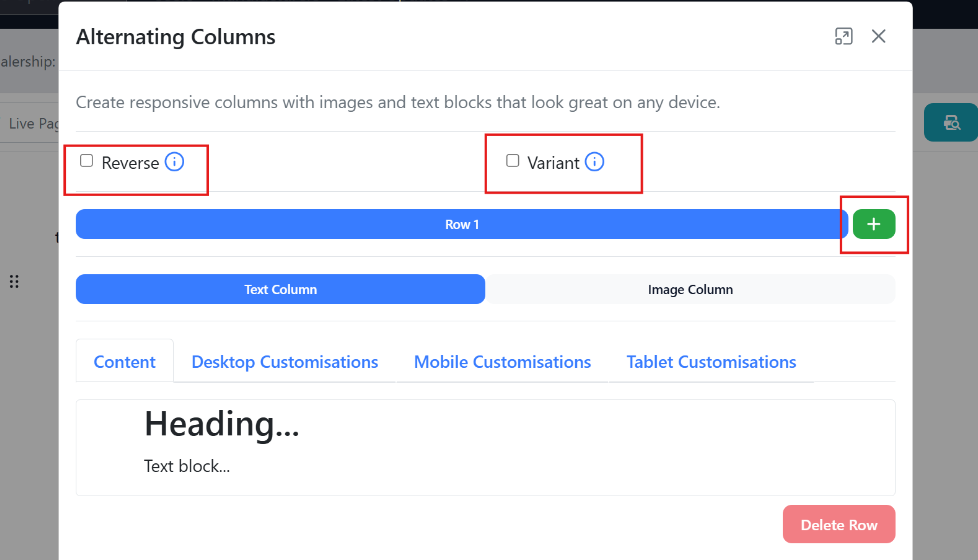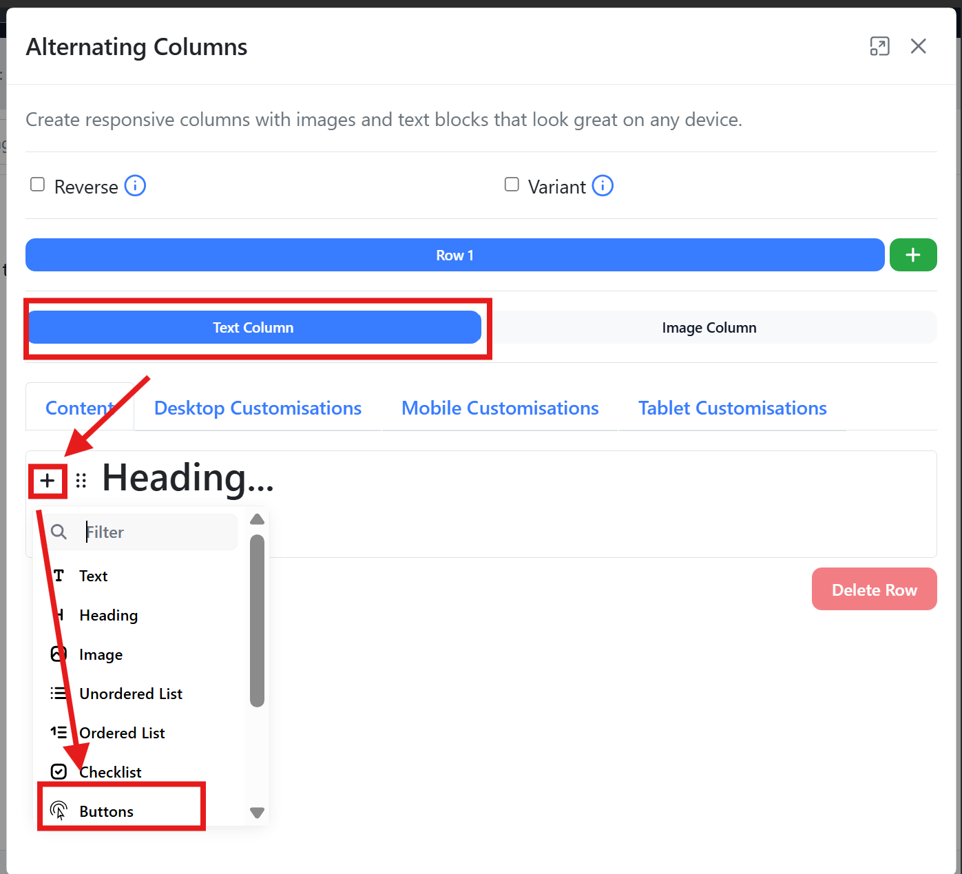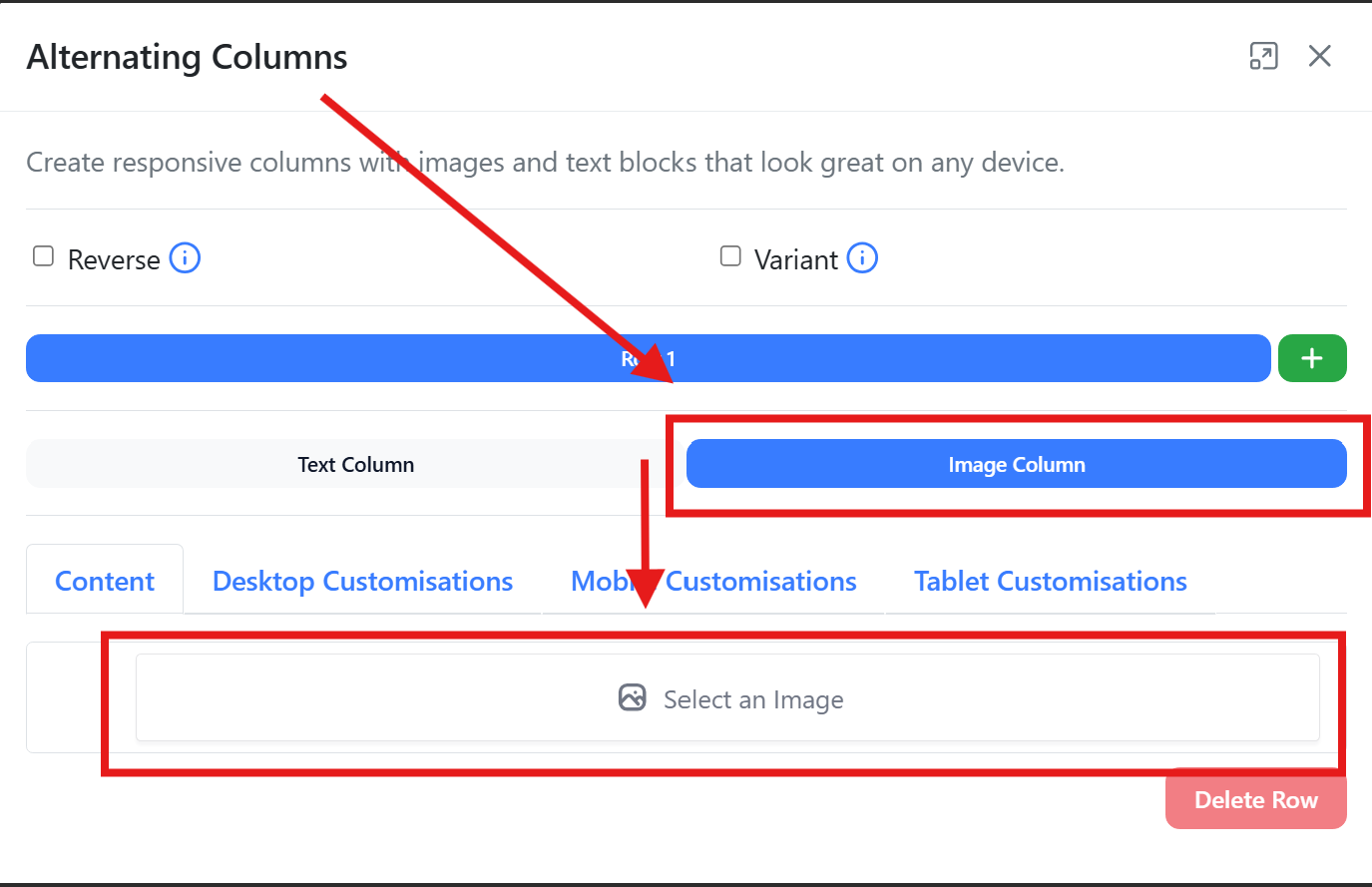 - Below adding rows, you can switch between the text column and the image column. If each row includes both an image and text, ensure you add the content to the appropriate column to maintain the alternating layout between rows.