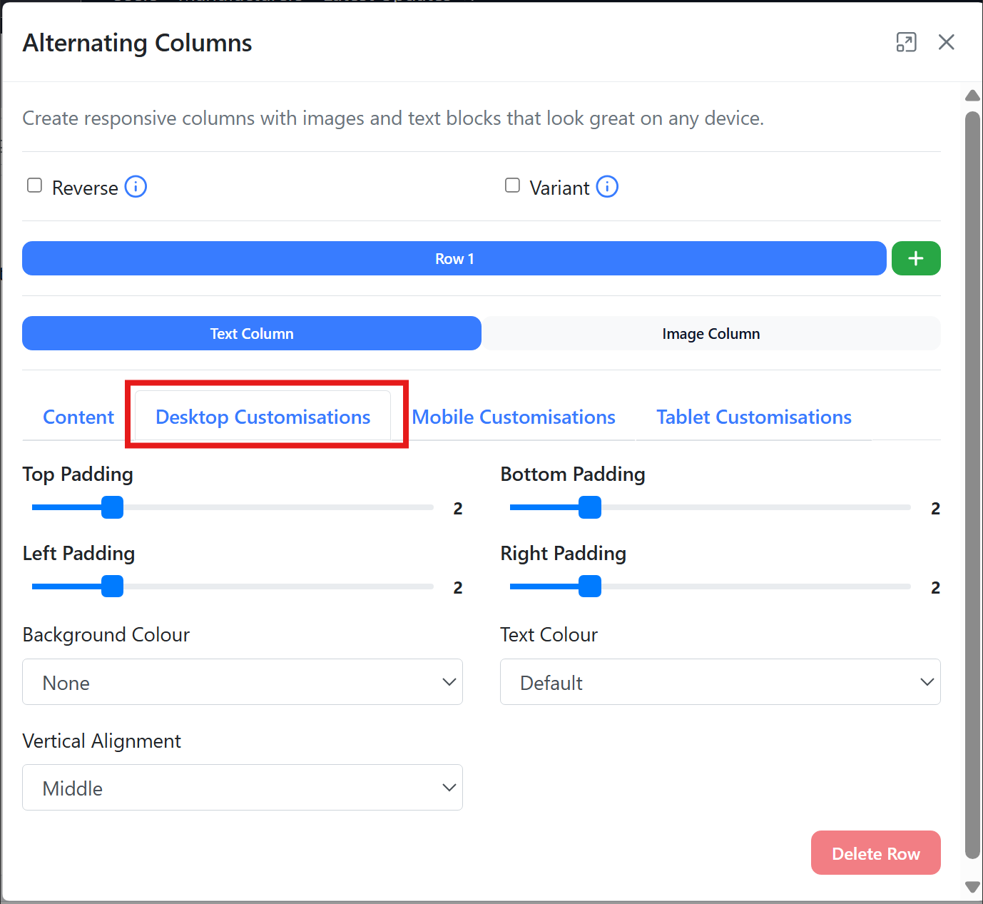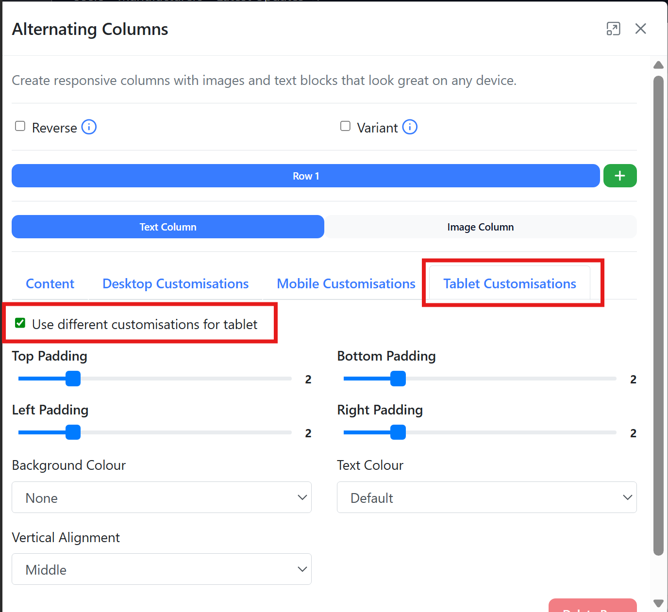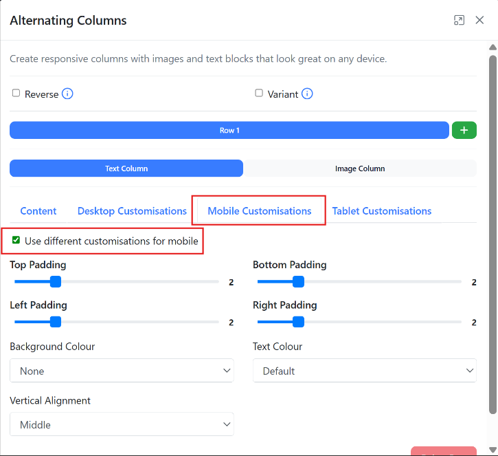 You can amend custom desktop, mobile and tablet customisations in the same way as the text column.