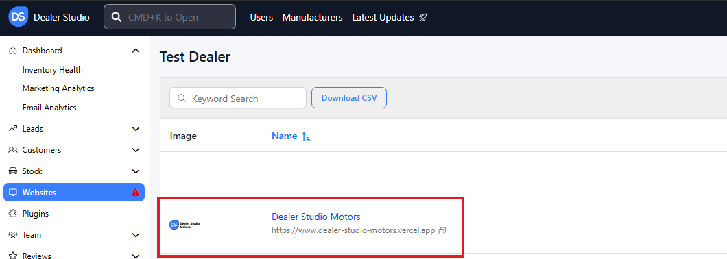 Step 1: On the Dealership Dashboard, select Websites
