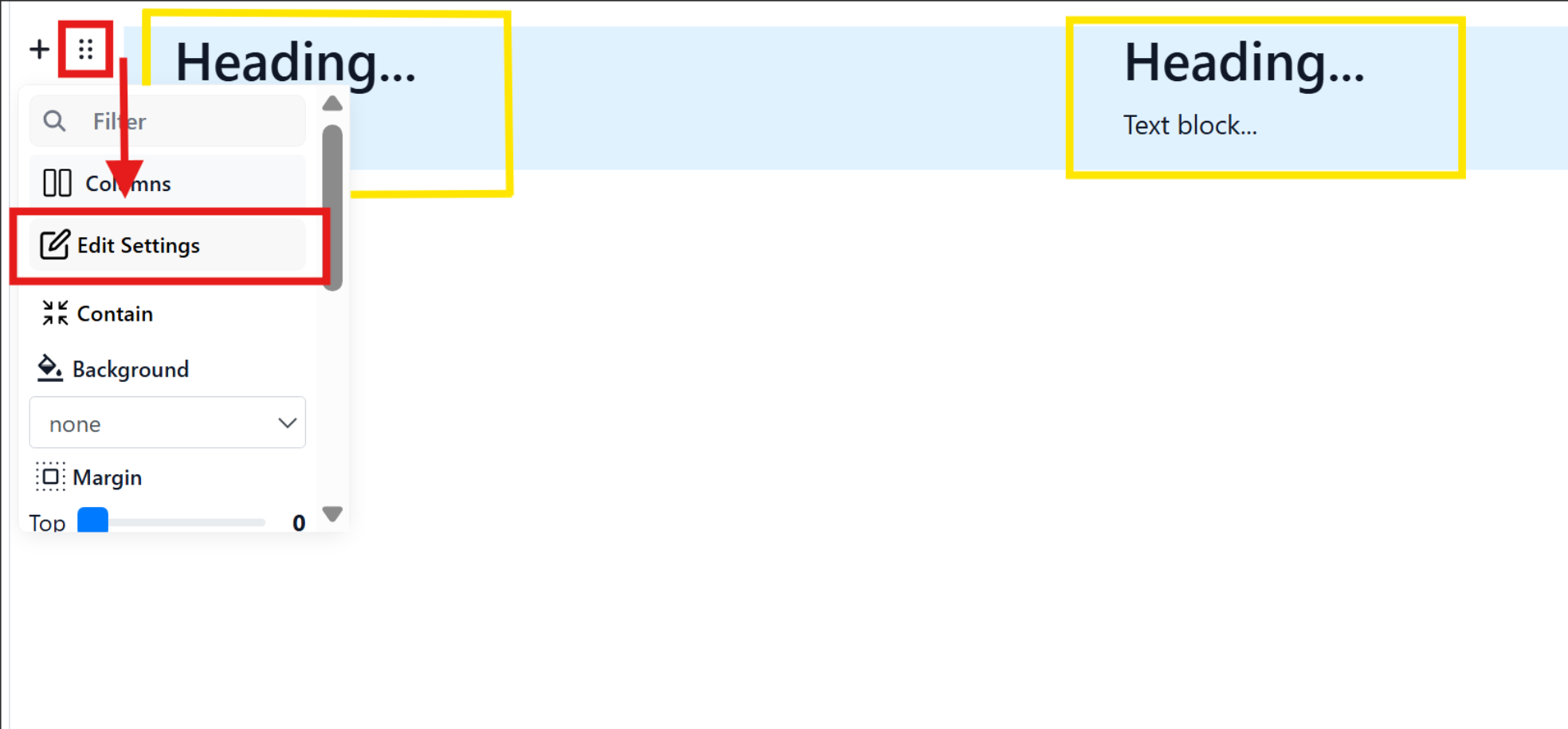 Two lots of text with Heading... and Text block... will appear. Hover your mouse over the left-hand side of the page where this text is until the 6 dots icon appears. Click on the icon, then select the Edit Settings button.