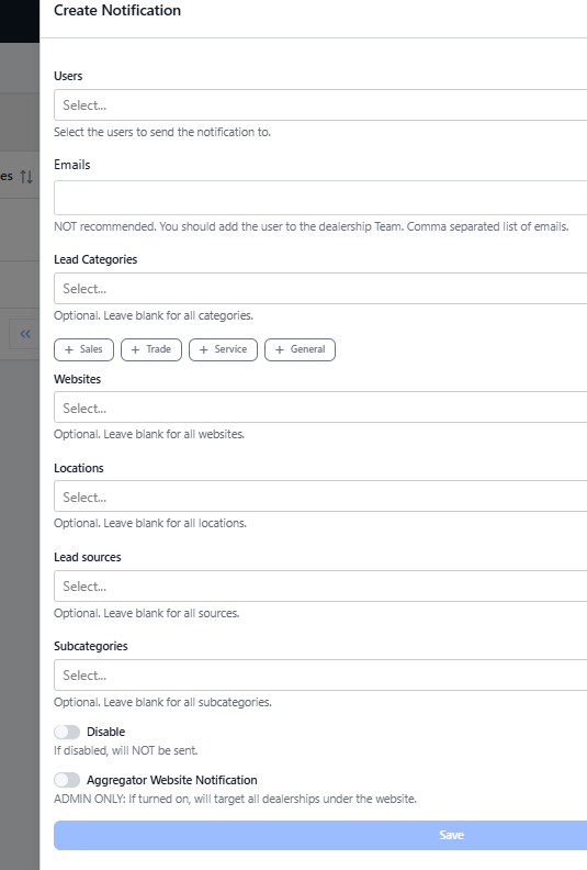 Lead Notifications allow you to instantly alert your team when a new lead is generated in Dealer Studio. You can send notifications to one or multiple team members and filter them to specific enquiry types or bookings (also known as Lead Categories).
