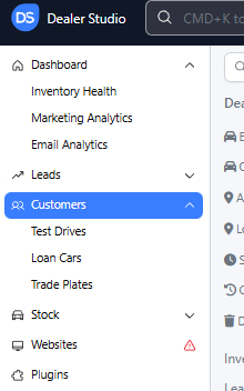 Contacts, Test Drives, Car Loans, and Trade Plates.
