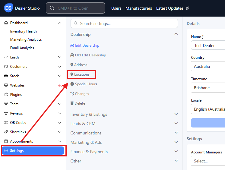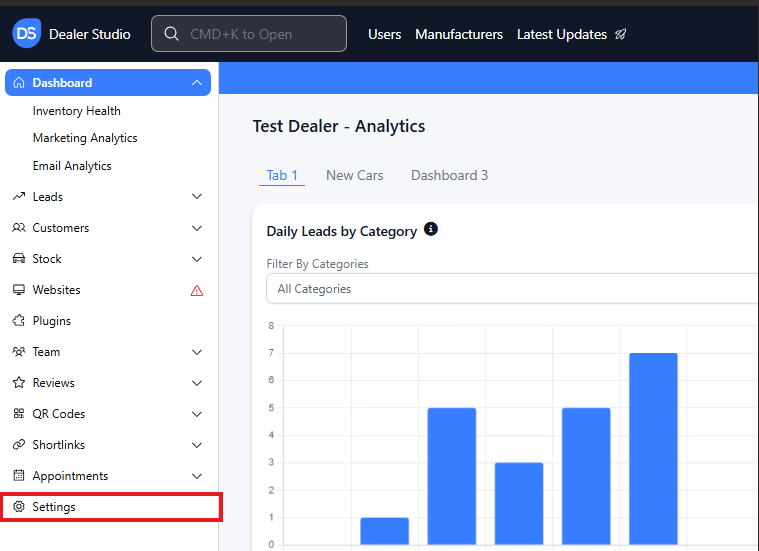 Step 1: On the Dealership Dashboard, Settings on the Bottom Left menu