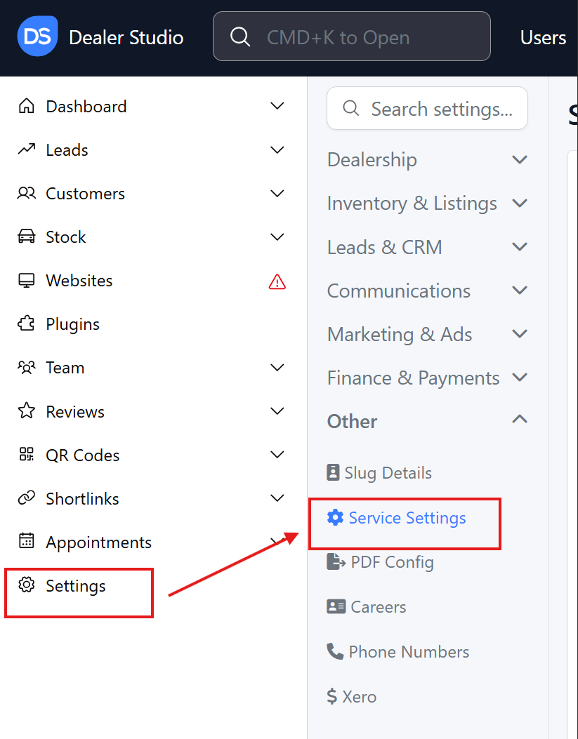 Step 1: On the Dealership Dashboard, Settings on the Bottom Left menu