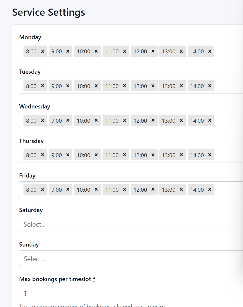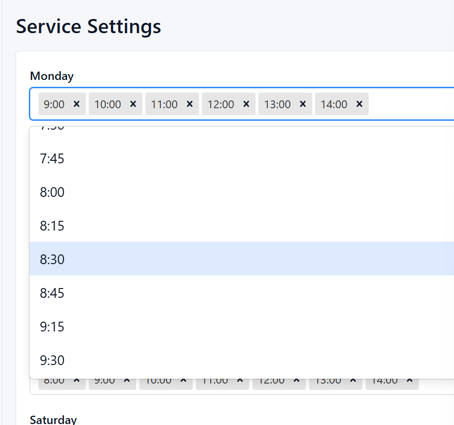 With the settings tool, you can easily modify time slots, open or close specific days, set capacity limits, and ensure customers can only book when your team is actually available. Keeping these times up to date helps prevent overbooking, improves workflow, and provides a smoother experience for both staff and customers.