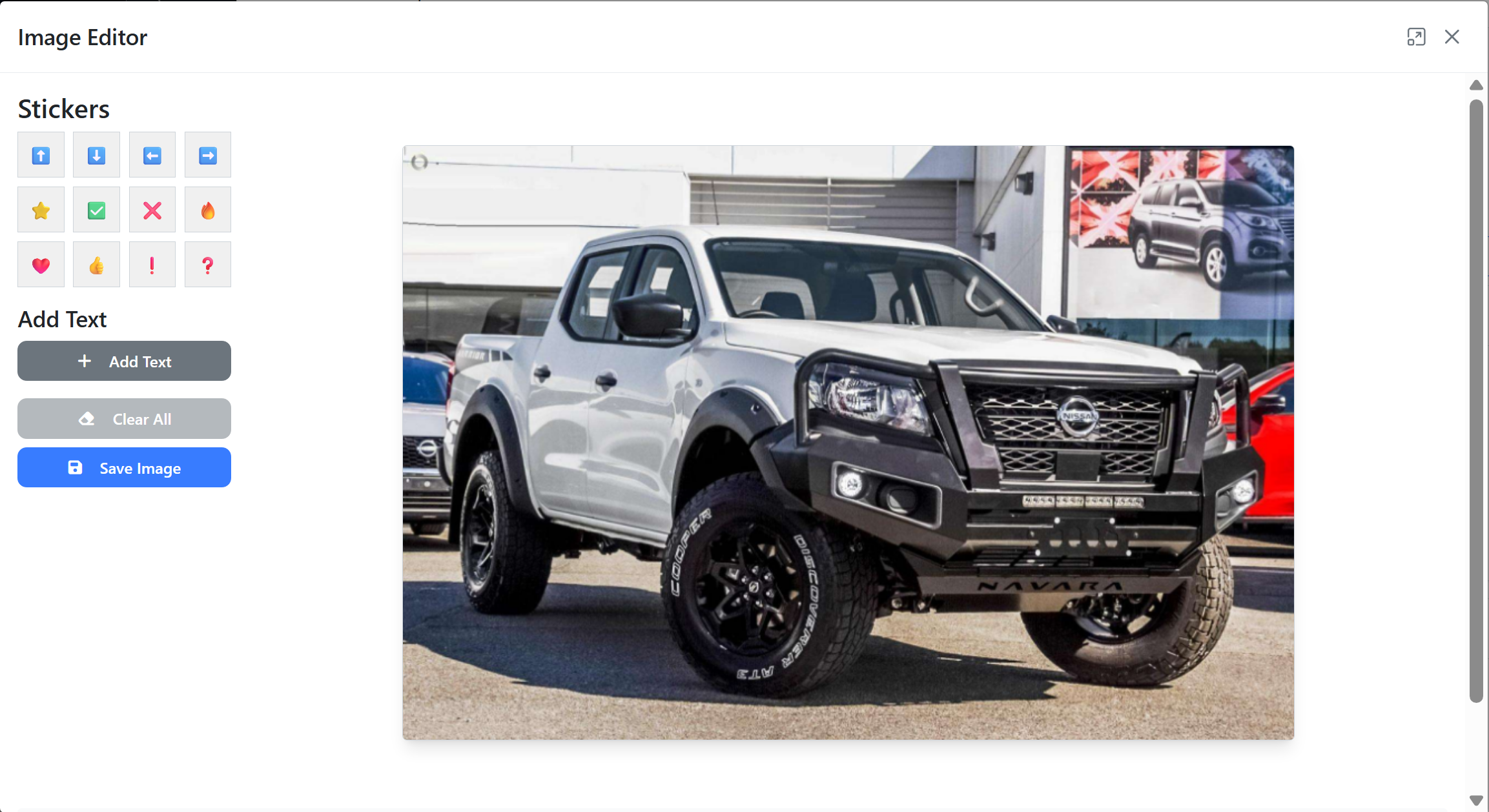 Within the Image Editor, you’ll find a selection of pre-set stickers including arrows, symbols, and emoji-style icons. You can also add text, clear all applied elements, and save the edited image directly back to the vehicle listing.