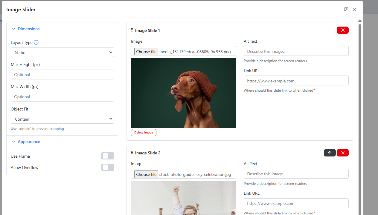 Using the Page Editor, you can quickly insert an Image Slider, add images, and customise settings such as transition effects, speed, and navigation controls. You can also adjust the size and layout to ensure the slider fits seamlessly within your page design and provides an optimal viewing experience across all devices.