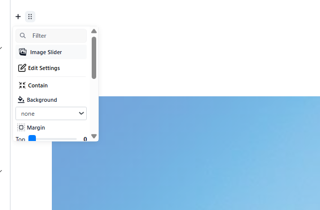 Navigate to the desired area of the page. Hover your mouse over the left-hand side until the + icon appears. Click on the icon, then scroll down and select the Image Slider button.