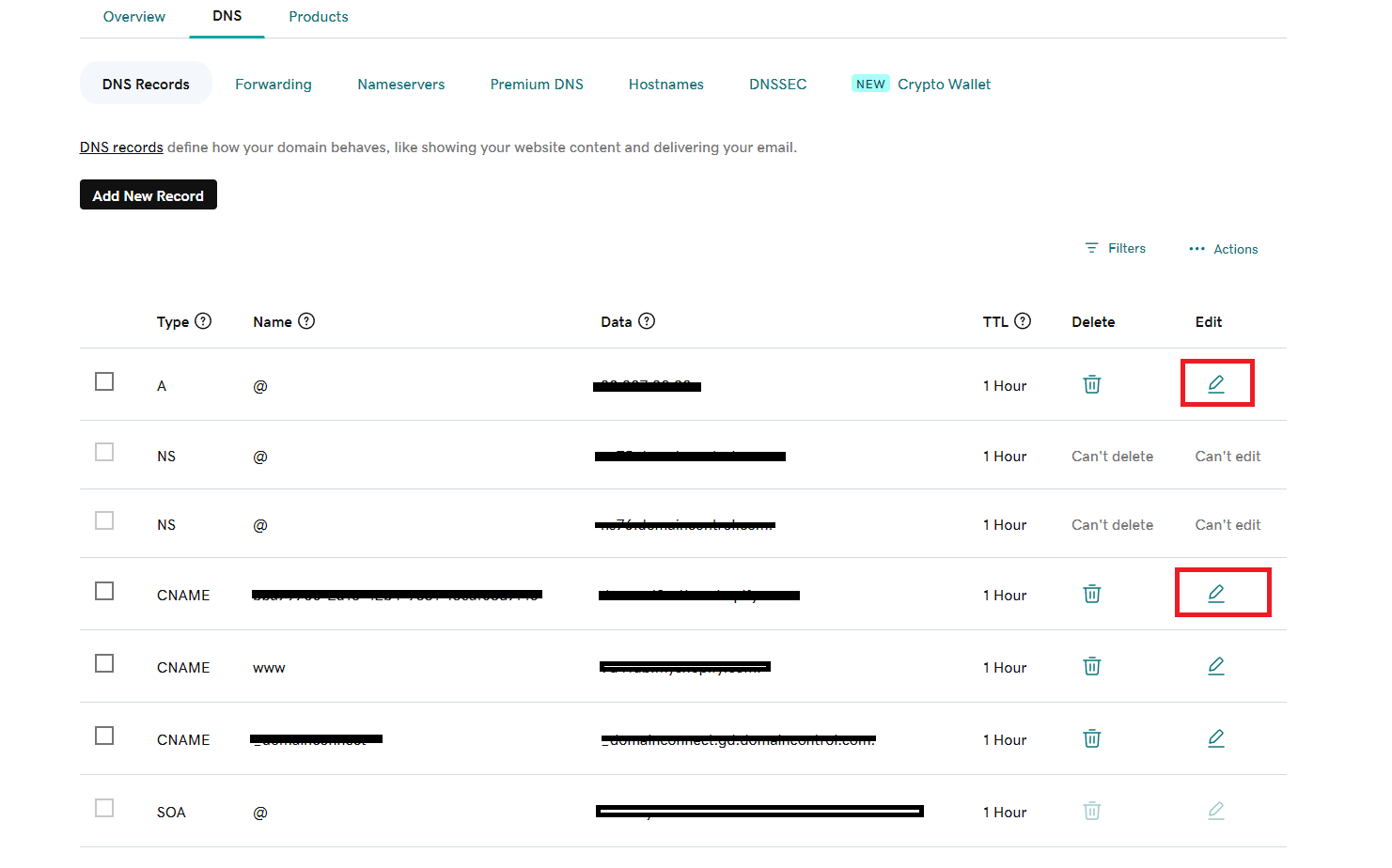 Be extremely careful when editing NS (Name Server) records — these control where DNS is managed