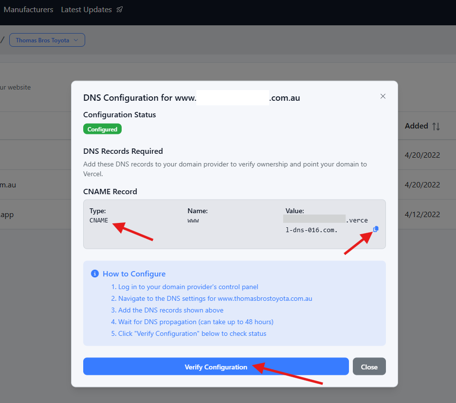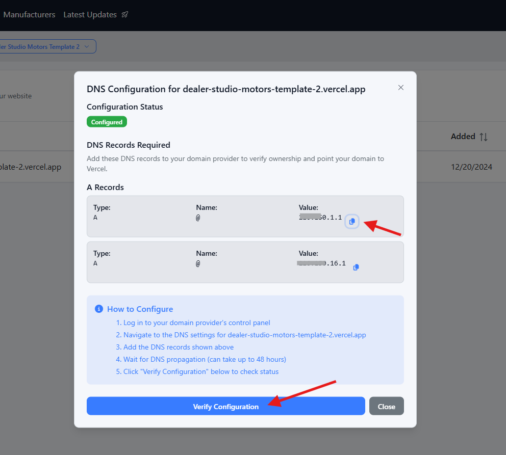 Dealer Studio will show the exact values you must copy and paste into your DNS provider.